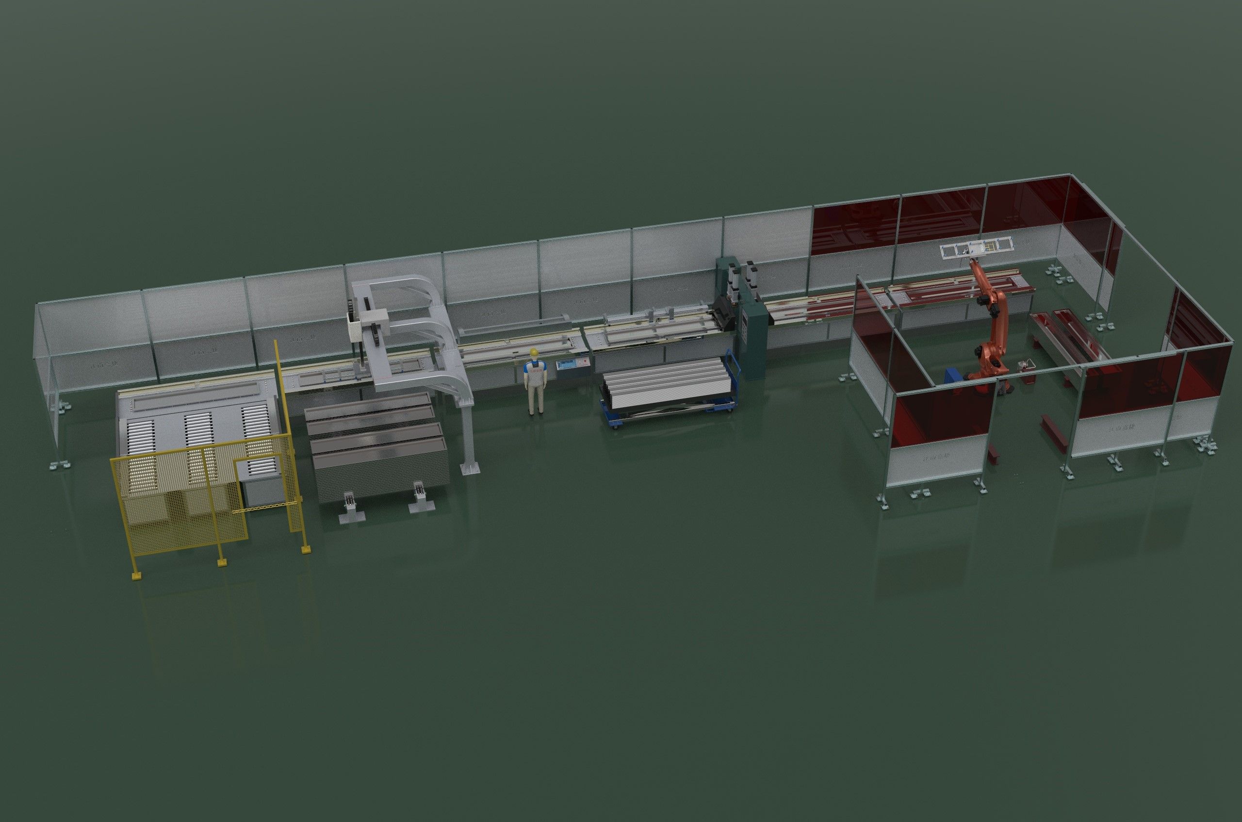 5、焊機(jī)及成品下料區(qū): 通過(guò)設(shè)備進(jìn)行自動(dòng)焊接,焊接高度小于門(mén)板鐵皮高度,當(dāng)焊接完成后,機(jī)器人工位自動(dòng)翻轉(zhuǎn),使用吸盤(pán)進(jìn)行自動(dòng)取下,按預(yù)定軌跡進(jìn)行堆放,當(dāng)一個(gè)成品料堆,堆放達(dá)到指定要求時(shí),系統(tǒng)給予提示,并自動(dòng)選擇另一個(gè)堆放平臺(tái)進(jìn)行下料,保證下料料堆更換線(xiàn)體不停機(jī)。機(jī)器人選用庫(kù)卡 KR210R2700EXTRA。